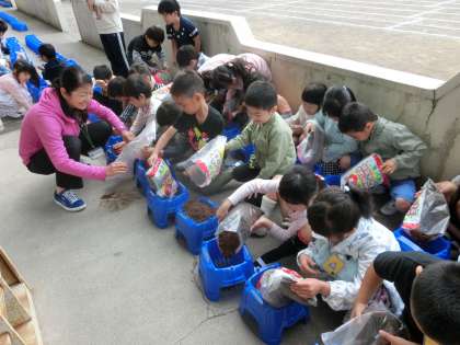 1年生は、生活科の学習で、あさがおを育てます。1組の子どもたちが、あさがおの種ををまく鉢に、土を入れました。