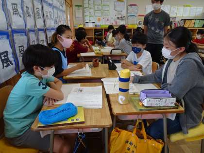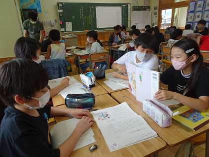 6年の国語では、「AIで言葉と向き合う」という文章の構成をグループで考えました。