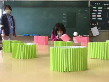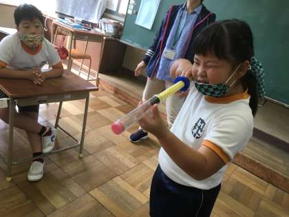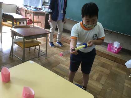 空気の力を使って的当てゲームをしました。みんな的をよく狙って発射!!空気の力を実感しながら、楽しくゲームをしました。