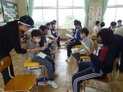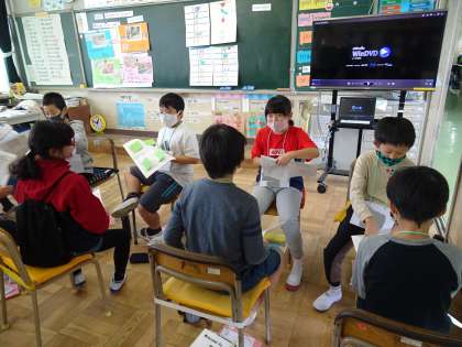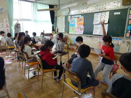 お店の人と、お客さんに分かれて、買い物の会話を練習しました。