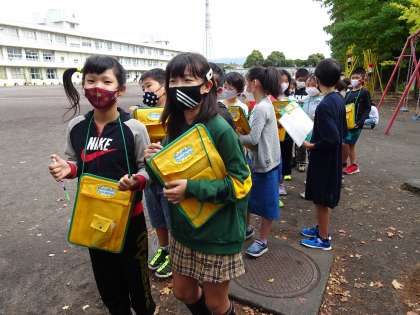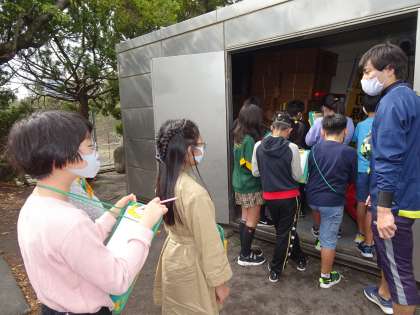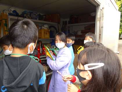「安全なくらしを守る」の学習で、運動場にある防災倉庫を見学しました。