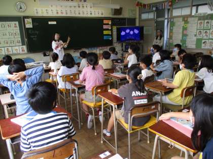 先生の英語のヒントを聴いて、アニメのキャラクターを当てるゲームを楽しみました。今回は「ドラえもん」の登場人物でした。