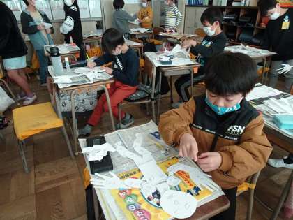 「楽しくうつして」の学習で、紙版画で印刷する人の形を作りました。