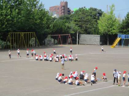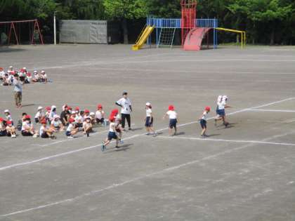 2クラス合同でリレーの練習をしていました。バトンを上手につなげようとがんばっています。