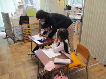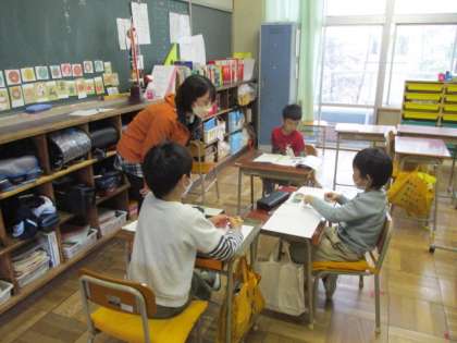 活動の手順を先生と確認して、教科書を読んだり漢字のプリントに取り組んだりしています。一人一人が自分のやるべきことに一生懸命取り組んでいます。