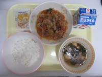 今日の献立は、米飯 牛乳 鶏肉のピリ辛焼き 野菜炒め かきたま汁 です。写真は、...