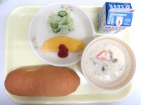 今日の献立は、黒糖ロールパン 牛乳 きのこのクkリームシチュー オムレツ ボイル...