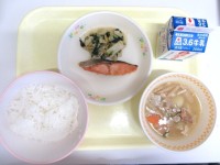 今日の献立は、米飯 牛乳 鮭の塩焼き ごまあえ すいとん です。写真は、おかわり...