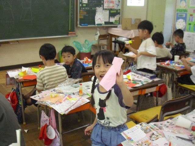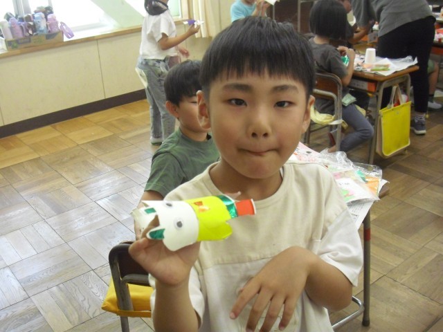 図工の授業です。紙コップを使っておもちゃを作っています。みんな装飾に工夫を凝らしています。