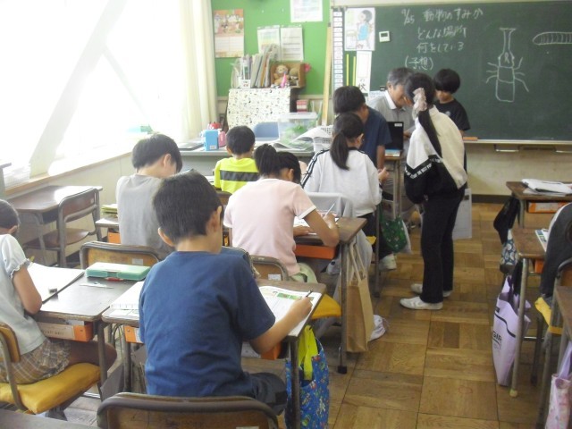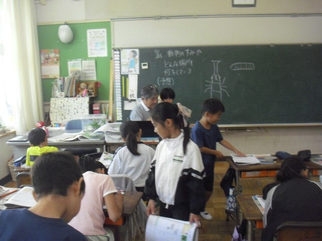 理科の授業です。バッタとカブトムシの絵を描いています。どこから足が生えているのかがとても重要となります。