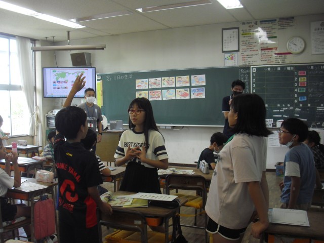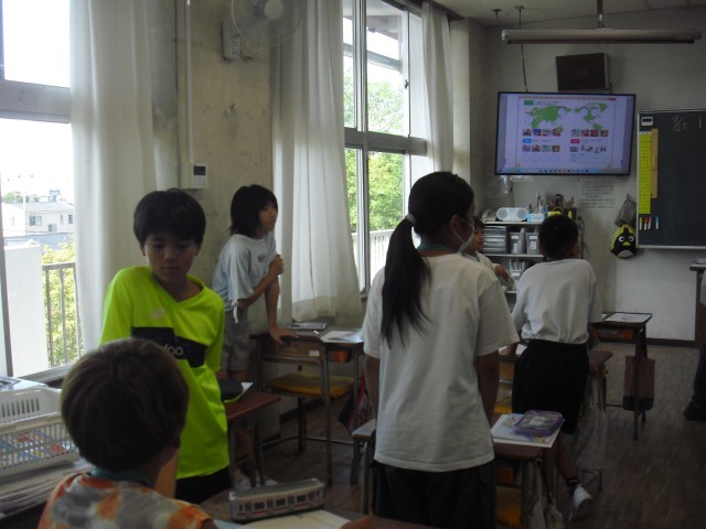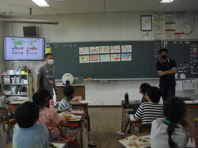 英語の授業です。映像を見て時刻と日課を線で結んでいます。何時に何をするのか英語で答えています。