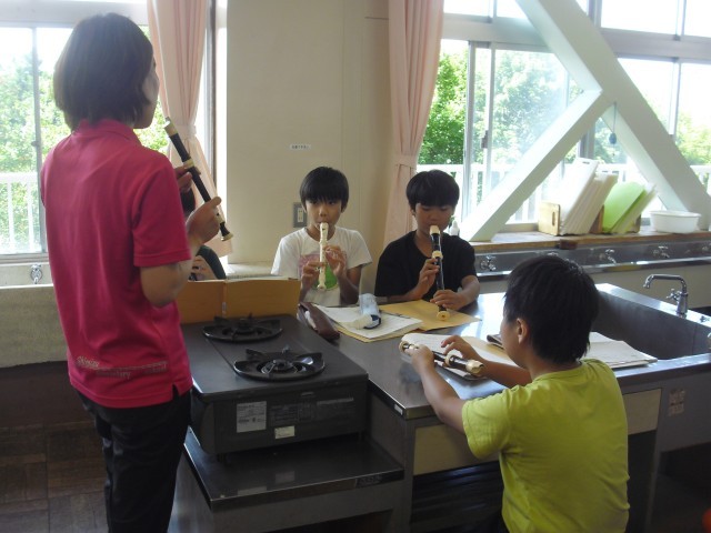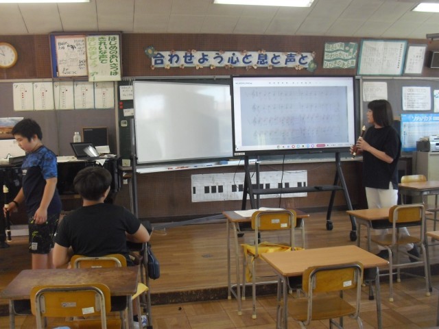 育成の授業です。音楽の授業です。リコーダーの練習を二手に分かれて学習しています。