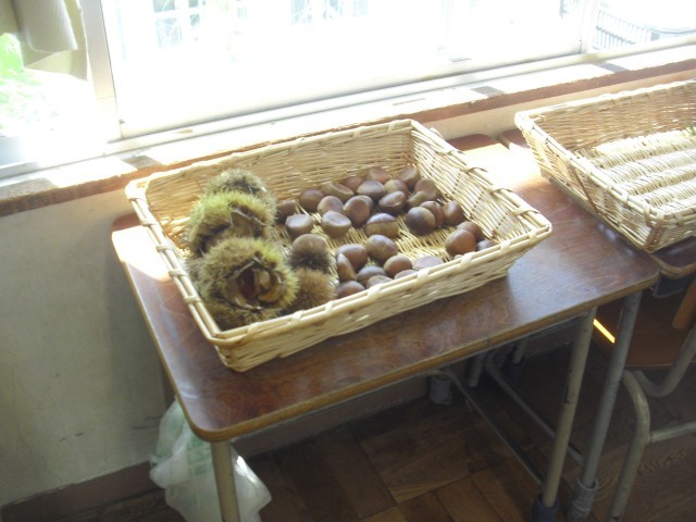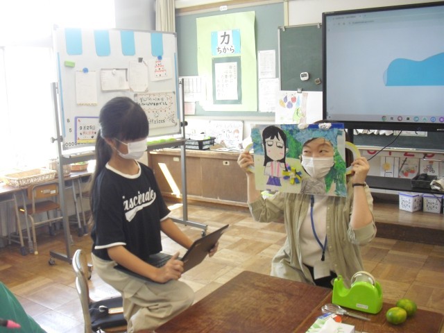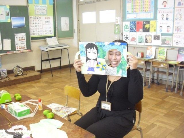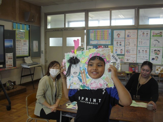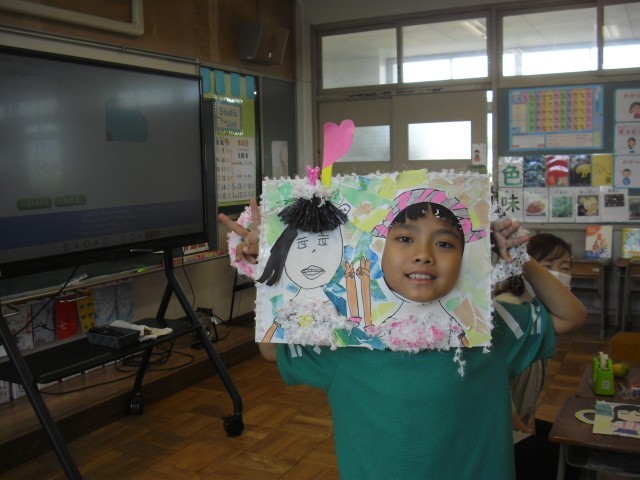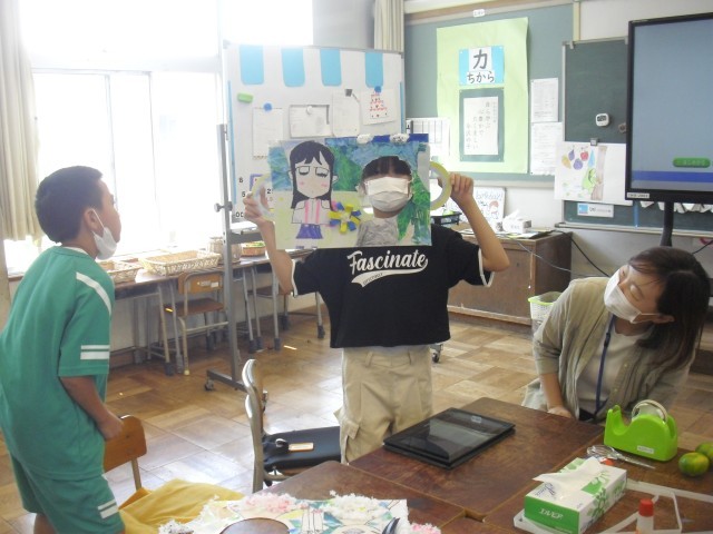 Umiの授業です。図工の顔出しパネルを作っています。支援員の先生方と一緒にはいポーズ!秋みつけも行っています。