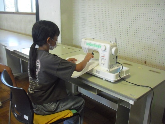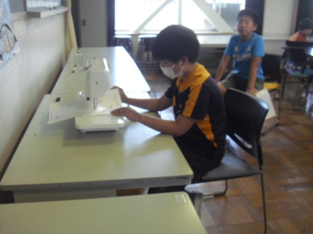 家庭科の授業です。ミシンの練習をしています。家庭科室にはエアコンがないので、大会議室を使っています。
