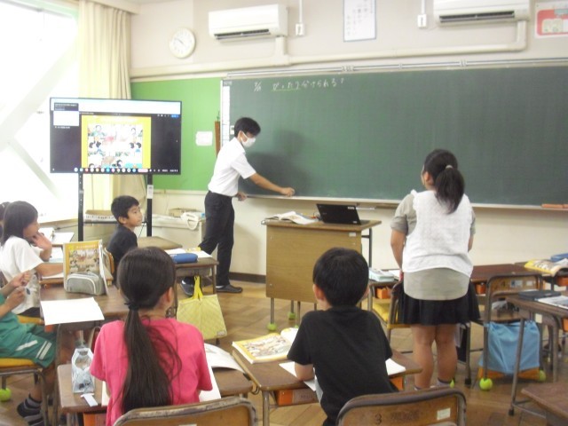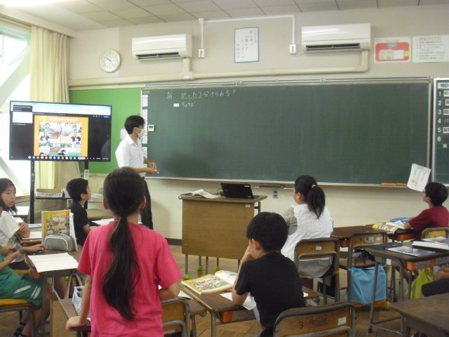 算数の授業です。「ぴったり」という言葉の持つ意味について、話し合っています。子どもとのやりとりを通して、あまりのあるわり算のイメージを共有することができました。