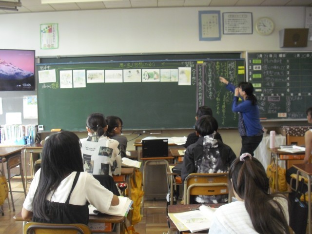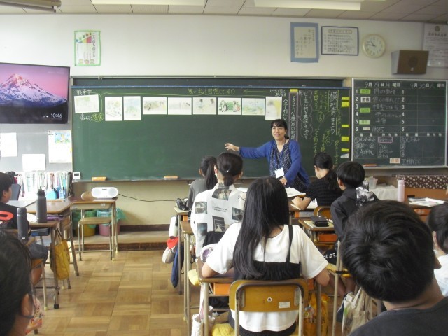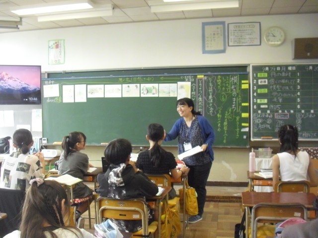 国語の授業です。「模型のまち」という物語文を学習しています。どのような構成の物語なのか、挿絵を見ながら考えています。