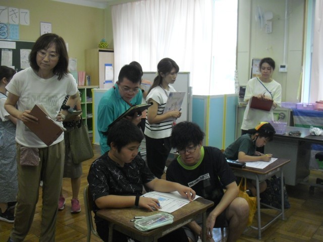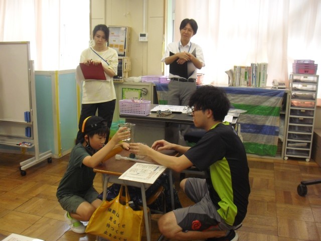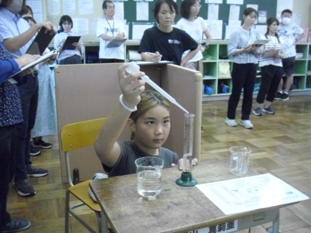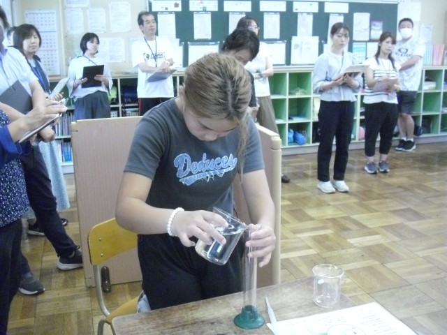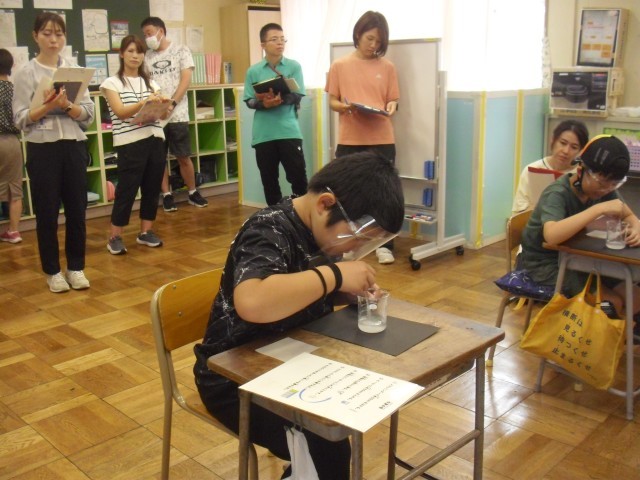 育成の授業です。理科の水溶液の性質について学習しています。食塩は水に限りなく溶けることができるのか、実験を通して学んでいます。