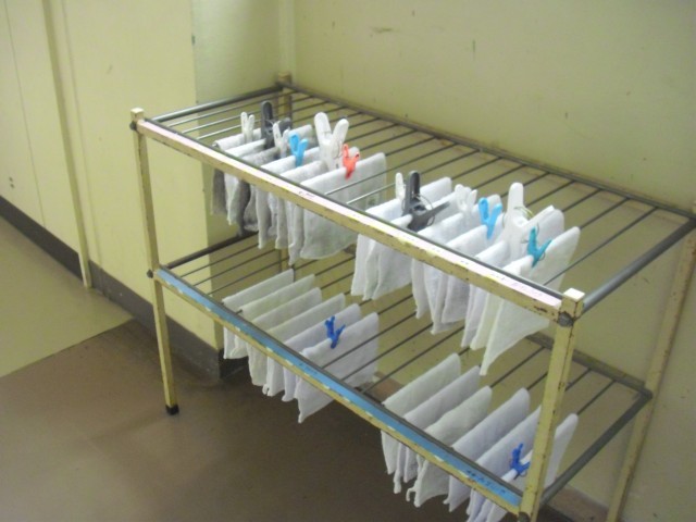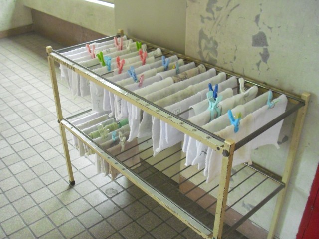 廊下を歩いていると、きれいに整頓されたぞうきんかけがありました。どのクラスもきれいに整理整頓されています。