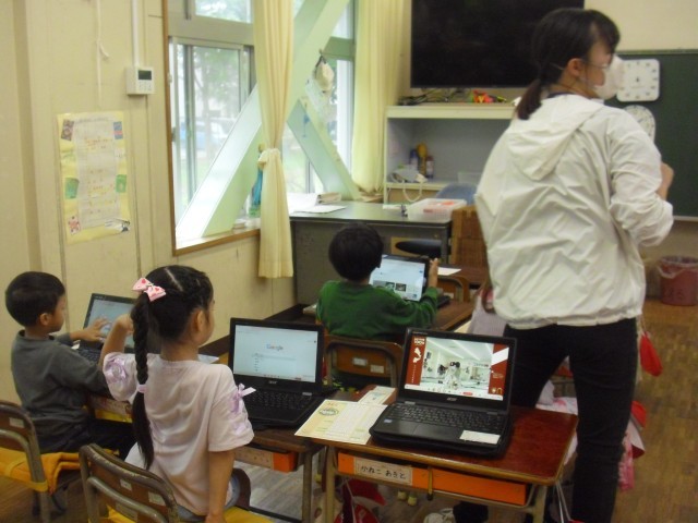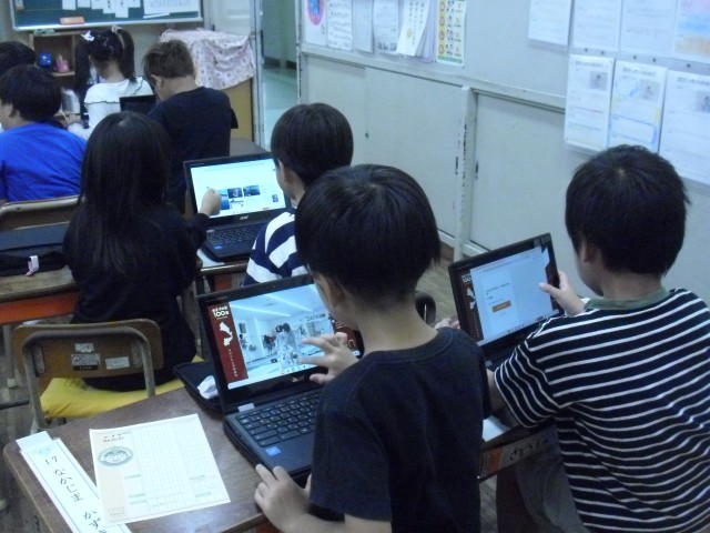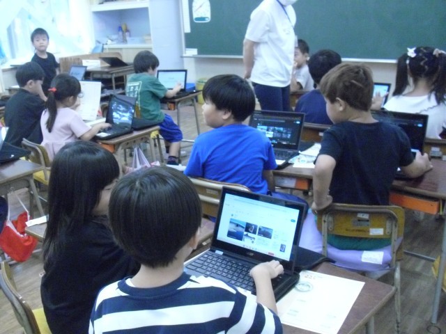 生活科の授業です。校外学習で見学する水族館の事前調べをしています。どのような魚がいるかパソコンを使って確認しています。