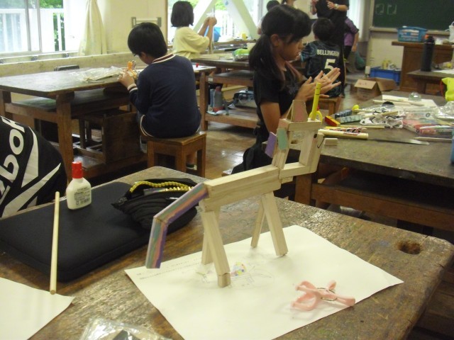 図工の授業です。木を上手にのこぎりで切って作成しています。みんな集中して取り組んでいます。