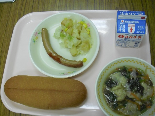 今日の給食 背割りロールパン 牛乳 焼きウインナートマトソースがけ ポテトとキャベツのソテー ワンタンスープ いただきます。