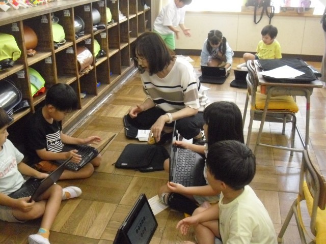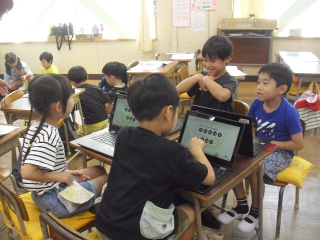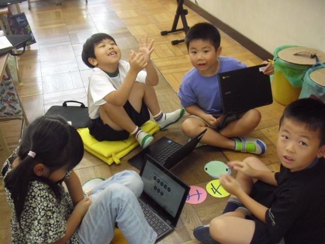 音楽の授業です。パソコンを使ってリズムうちの練習をしています。みんな楽しそうです。