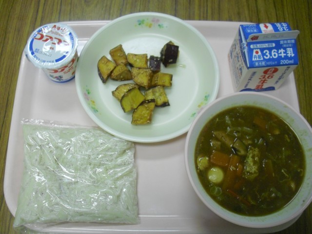 今日の給食 うどん 牛乳 カレー南蛮 大学芋 ヨーグルト いただきます。