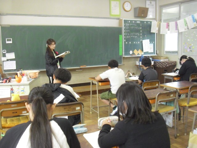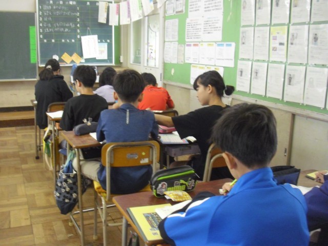 国語の授業です。説明文を先生が範読しています。聞きながら子供たちは段落分けをしています。このあと初発の感想を書くようです。