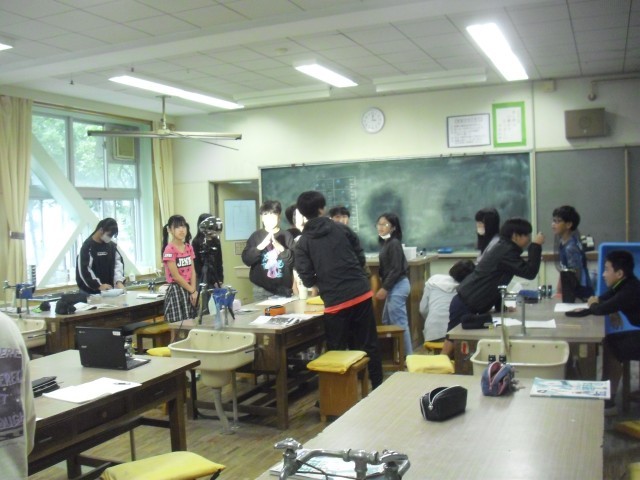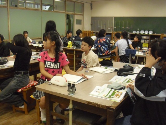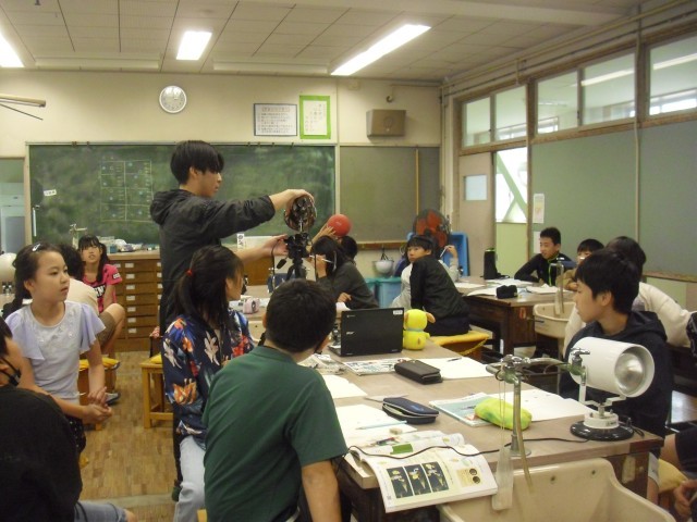 理科の授業です。月の形の見え方が日によって違うのはなぜか考えてます。導き出された仮説を実験によって証明しようとしています。