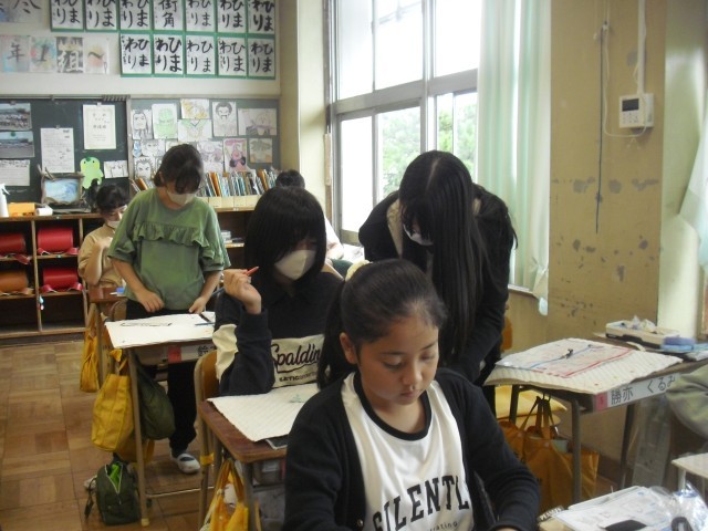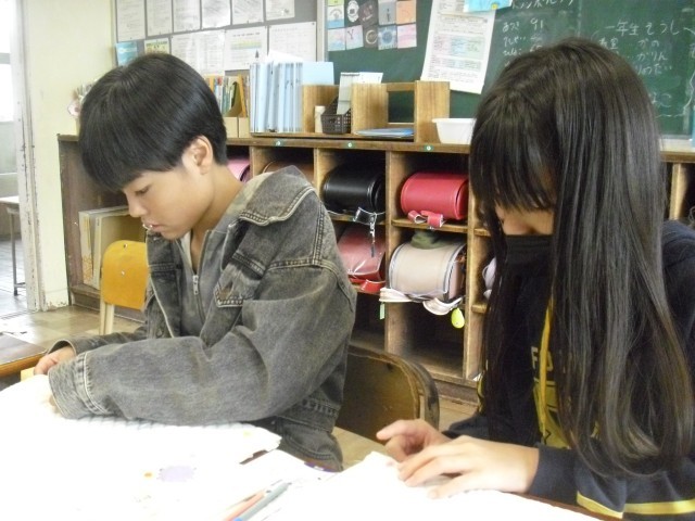 家庭科の授業です。ナップサック作りに挑戦しています。説明書を見ながら丁寧につくっています。