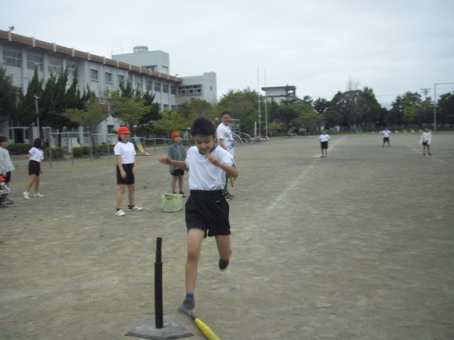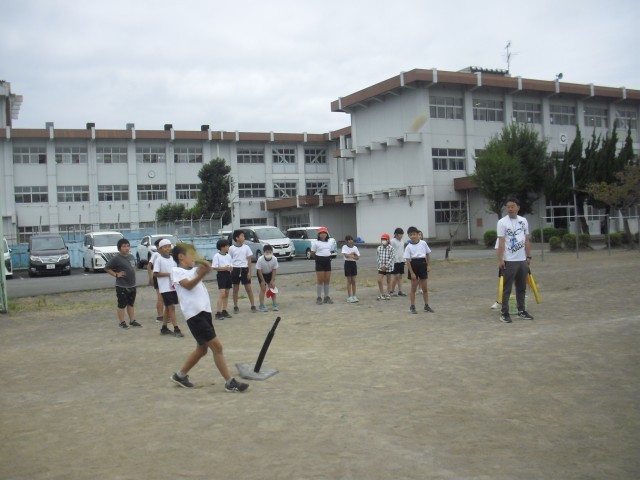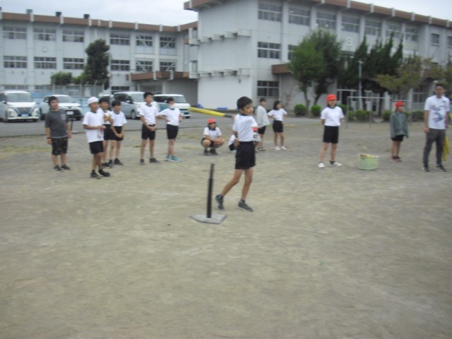 体育の授業です。Tボールの練習をしています。細かなルールがあるので、先生と一緒に確認しています。