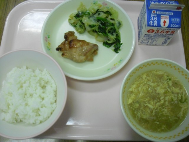 今日の給食 ご飯 牛乳 鶏肉の味噌焼き 辛子和え かき玉汁 いただきます。