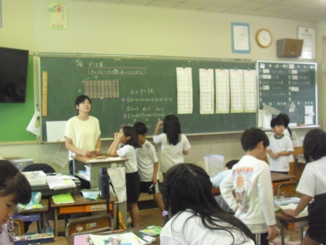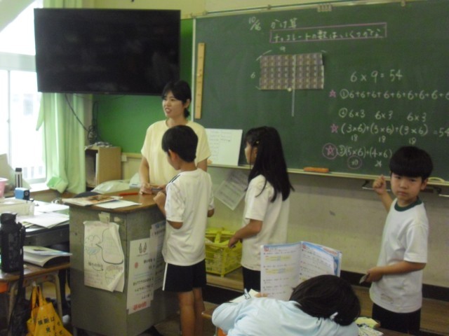 算数の授業です。かけ算の学習をしています。先生の前でかけ算九九の暗唱のテストを行っています。確実に覚えてほしいと思います。