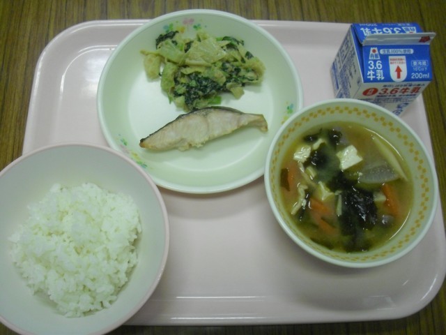 今日の給食 ご飯 牛乳 焼き塩鮭 ごま和え 秋野菜たっぷり豚汁 いただきます。
