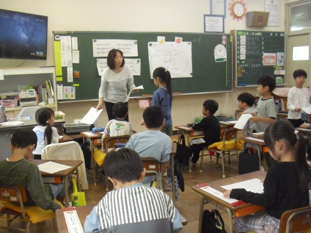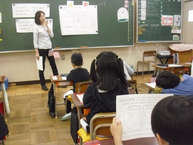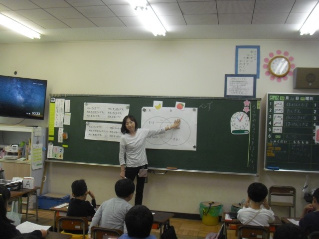 言語読解の授業です。前回ベン図を使って仲間分けをした果物について、今日は文章で表現しようとしています。