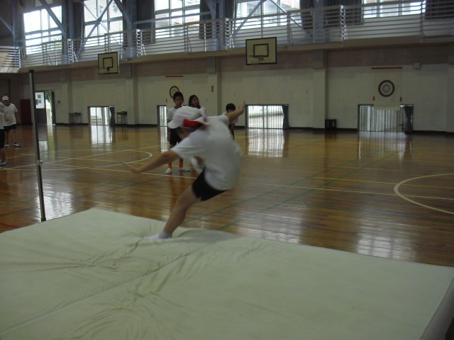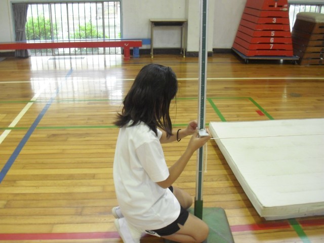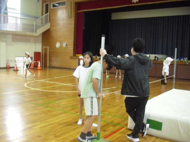 体育の授業です。走り高跳びの学習をしています。踏切のタイミングを合わせるのがとても難しいですね。