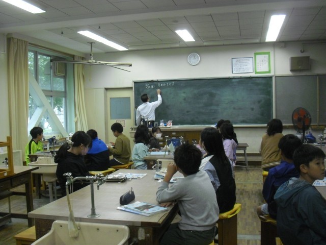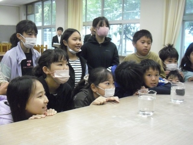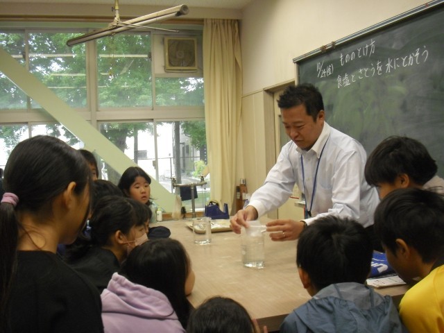 理科の授業です。ものの溶け方に違いがあるのかどうか調べています。今日は砂糖と塩を比べています。