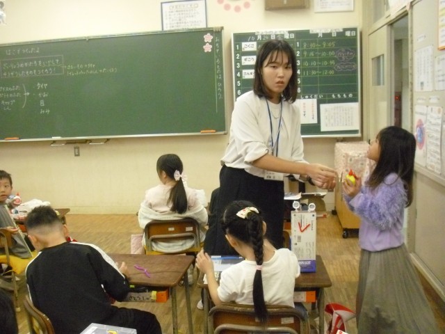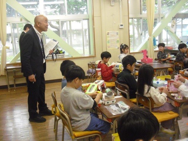 図工の授業です。材料の形を生かして想像したものを作っています。ポテトチップスのふたをタイヤにしてレーシングカーをつくっている児童もいて発想の豊かさに驚きました。