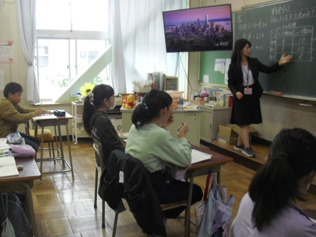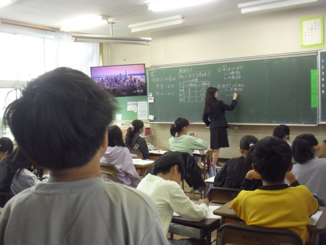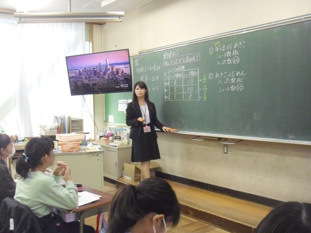 算数の授業です。割合の学習をしています。投げた数とゴールに入った数が比べられない時にはどうするか考えてます。
