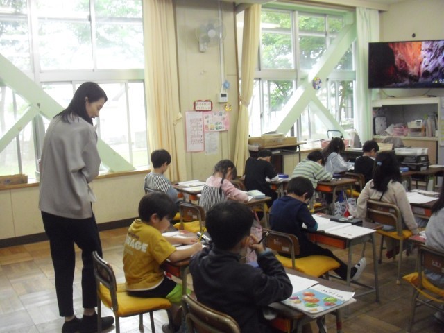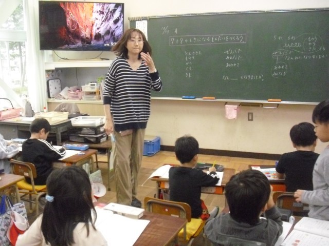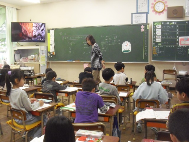 算数の授業です。7+8になる問題を考えています。足し算にも「合併」や「増加」などいろいろ意味があります。その意味を理解して意識して問題を作成すると足し算の本質を理解することになります。