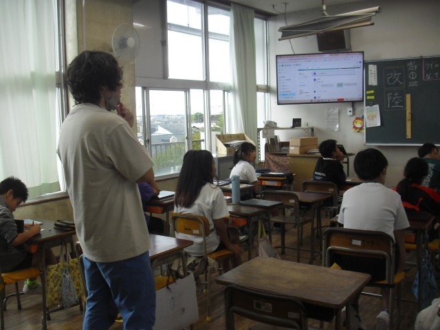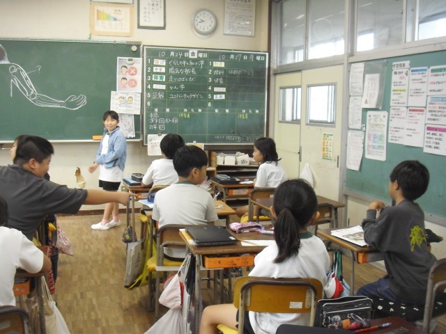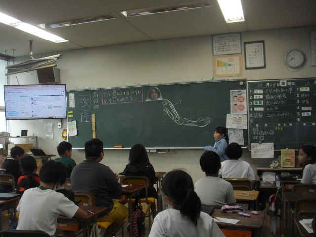 理科の授業です。腕には骨が何本あるか考えてます。二本あることに気づきみんな驚いていました。