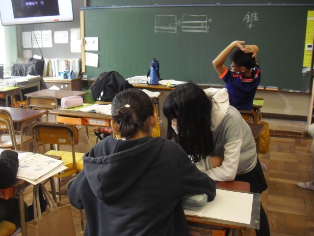 算数の授業です。直方体と円錐の関係について考えています。高さが一緒の場合、体積はどのような関係があるのでしょうか。なかなか難しいテーマです。