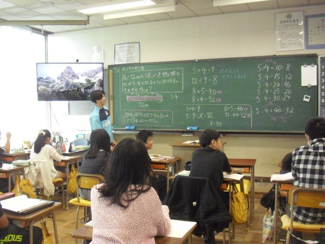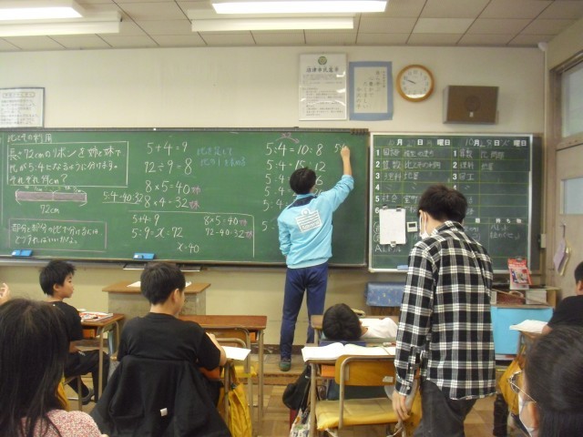 算数の授業です。長さが72センチのリボンを姉と妹で5:4になるように分ける方法を考えています。多様な考え方が出され、板書がいっぱいになってしまいました。子供たちの授業への集中が素晴らしいです。