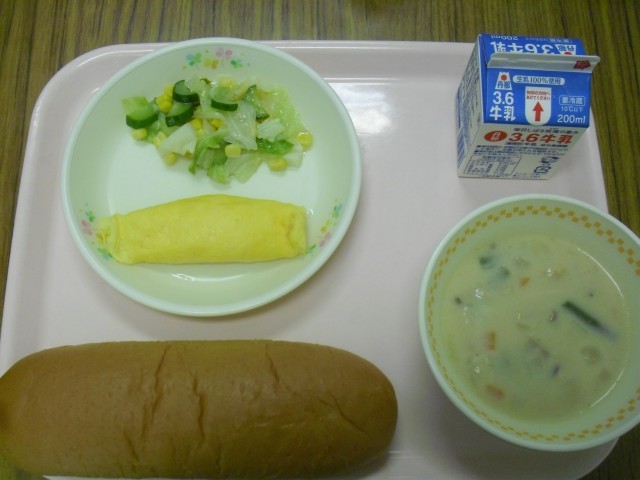 今日の給食 黒糖入りロールパン 牛乳 プレーンオムレツ フレンチサラダ きのこのクリームシチュー いただきます。
