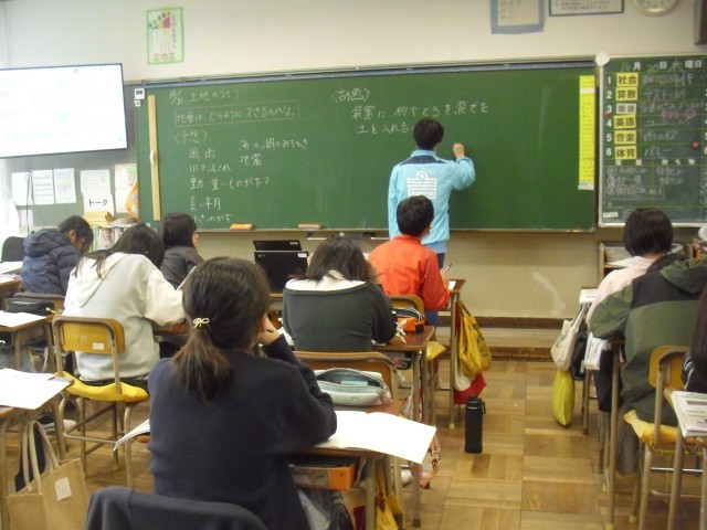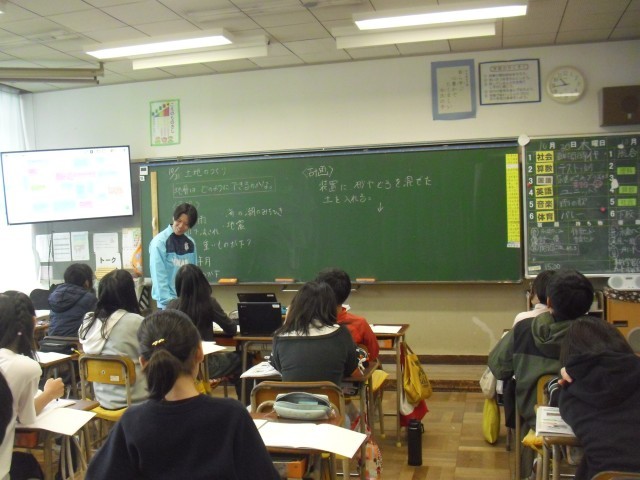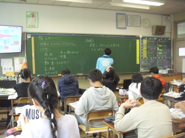 理科の授業です。地層はどのようにできるのか考えています。まず、予想を立てています。その後それを証明できるような実験方法を考えています。論理的思考力が形成される場面です。