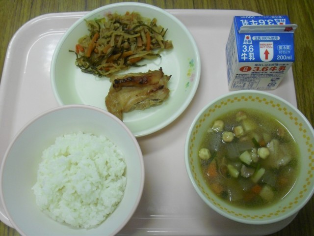 今日の給食 ご飯 牛乳 切り干し大根 鶏肉の味噌焼き のっぺい汁 いただきます。