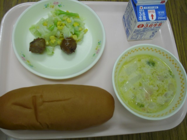 今日の給食 黒糖入りロールパン 牛乳 肉団子の甘辛和え カリフローレサラダ クリームスープ いただきます。