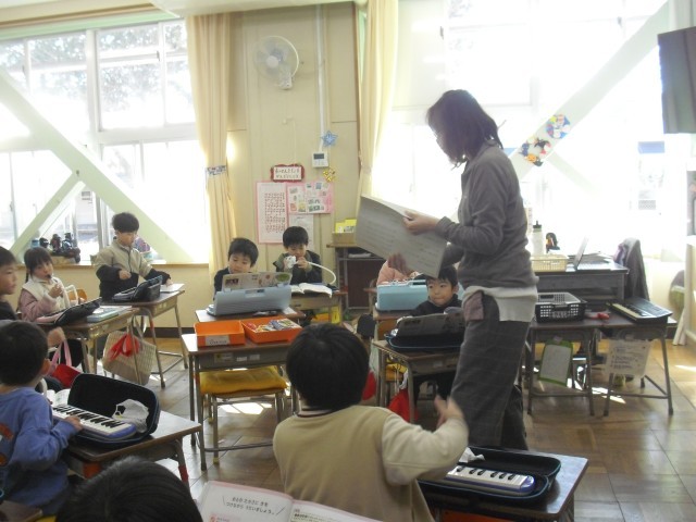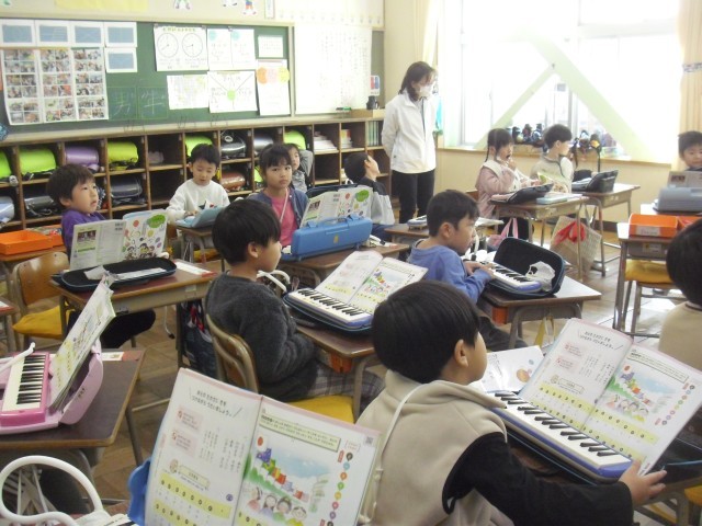 音楽の授業です。鍵盤ハーモニカの練習をしています。一糸乱れぬ演奏をしたかと思えば、先生の話をしっかり聞くなどしっかりとしてけじめができているクラスです。素晴らしいと思います。