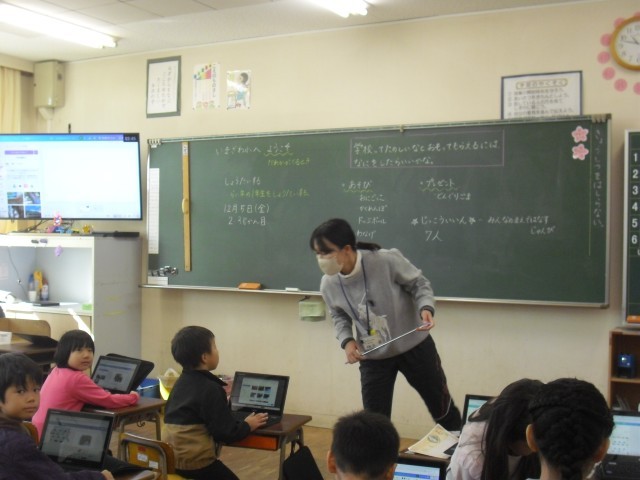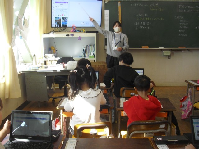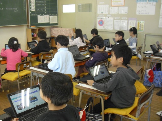 学活の授業です。パソコンのプレゼンテーションソフトを使って今沢地区のよいところを作成しています。子供たちが簡単に作っているのを見て大変驚きました。