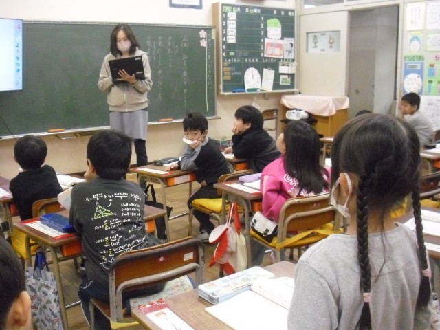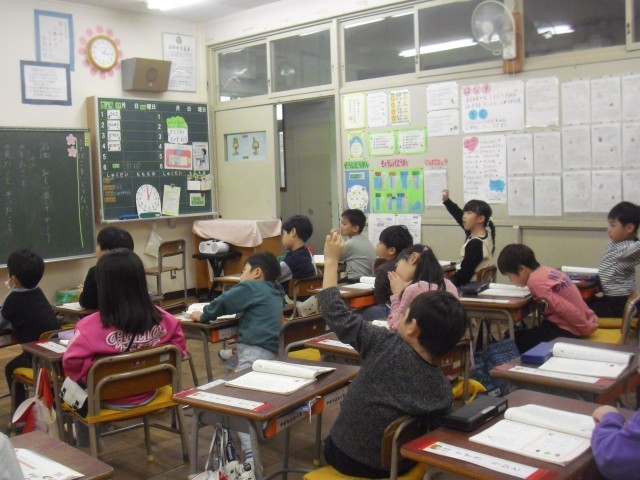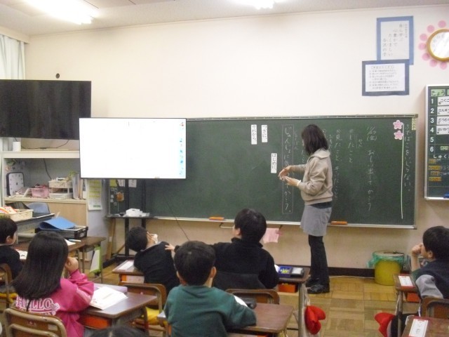 国語の授業です。作文を上手に書くために、順序を表す言葉を学習しています。例文の中から探して発表しています。